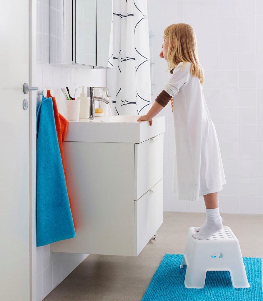 Umývadlo zavesené v štandardnej výške je pre deti príliš vysoko, preto ho doplníte stupienkom alebo stoličkou. Tiež detské schodíky k umývadlu vyberte také, ktoré majú protišmykový povrch. To isté platí pre schodíky na WC.