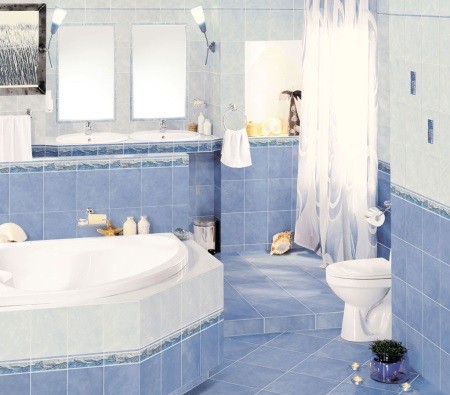 - kombinácia svetlejšej a tmavšej modrej (napr. obklady + textílie),