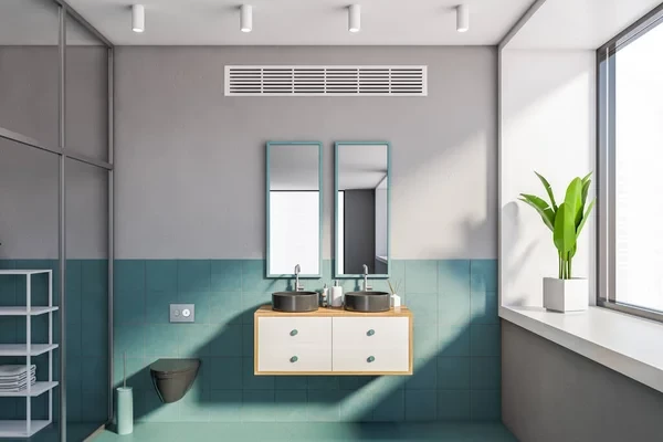 - modrá ako dominantná farba na stenách/obkladoch alebo v detailoch,