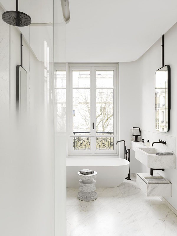 - drobné detaily, ktoré rozbíjajú bielu: rámčeky, elegantné flakóny kozmetiky, mydlenky, držiaky na kefky,
