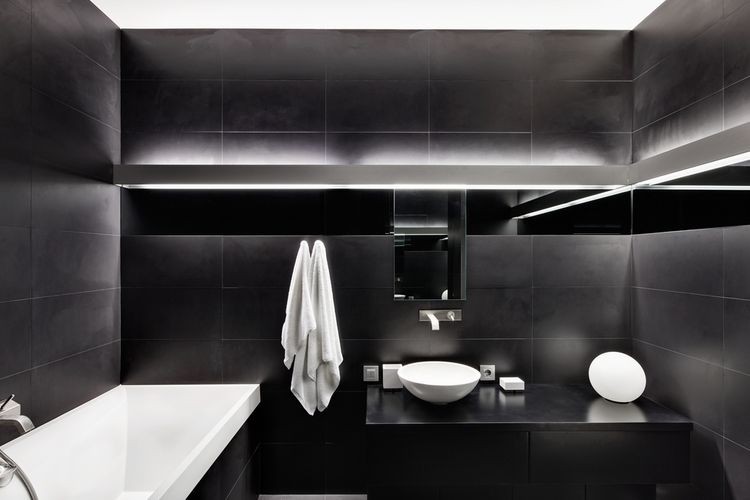 Presne premyslené osvetlenie jednotlivých kúpeľňových zón je nevyhnutné. Len tak bude kúpeľňa pôsobiť hlboko a elegantne, nie tmavo a nekonečne.