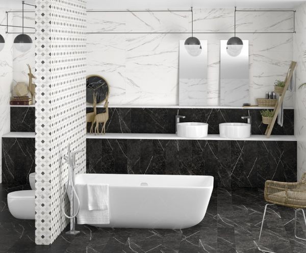 - čierna na veľkých plochách (dlaždice, nábytok) vyzerá najlepšie v jednoduchých líniách,