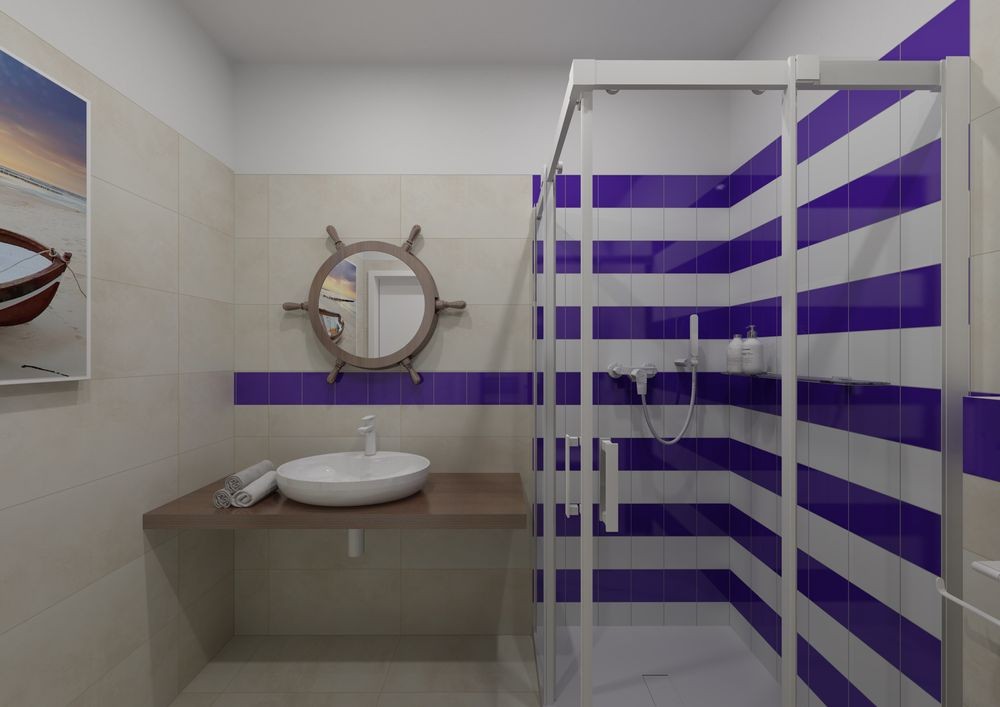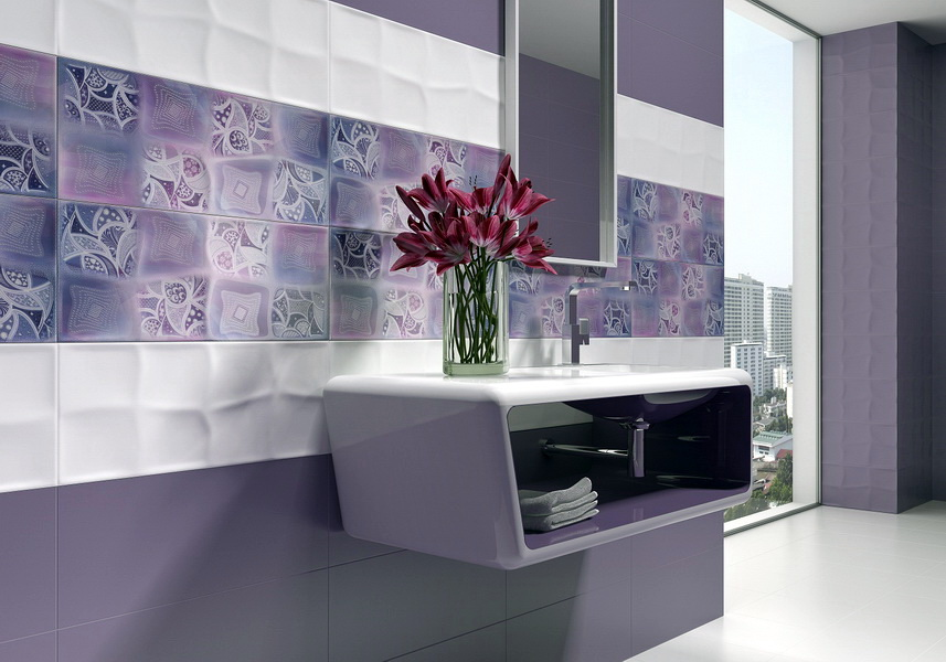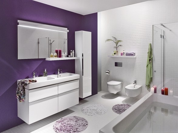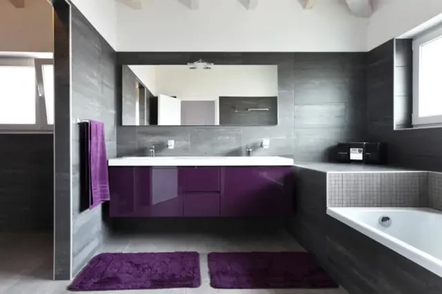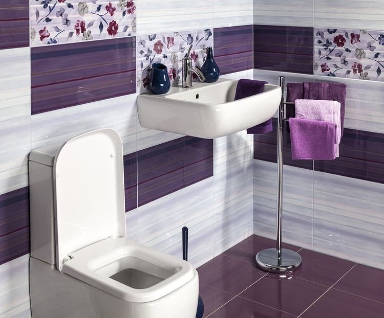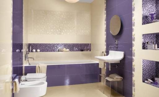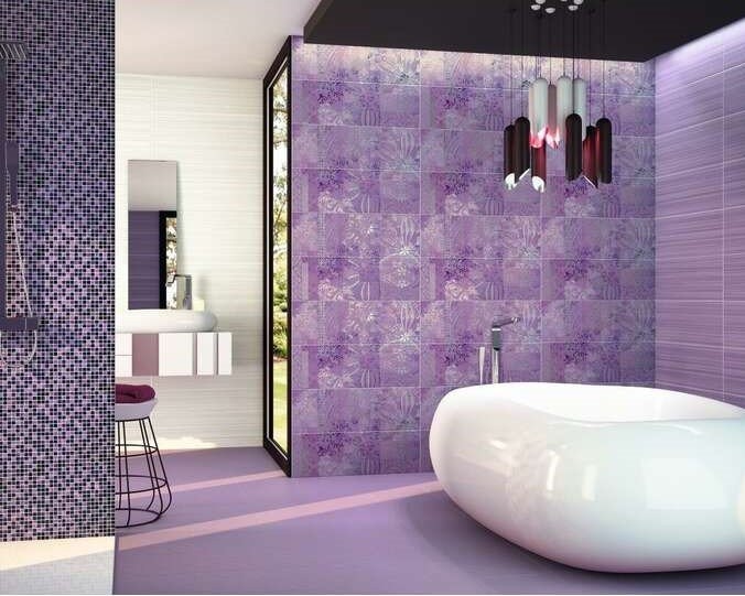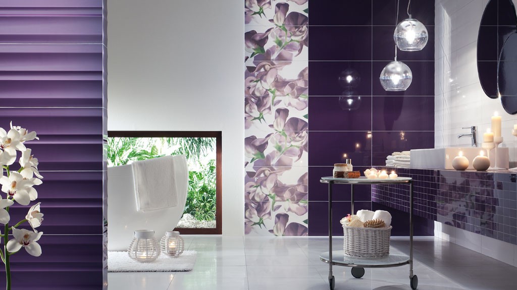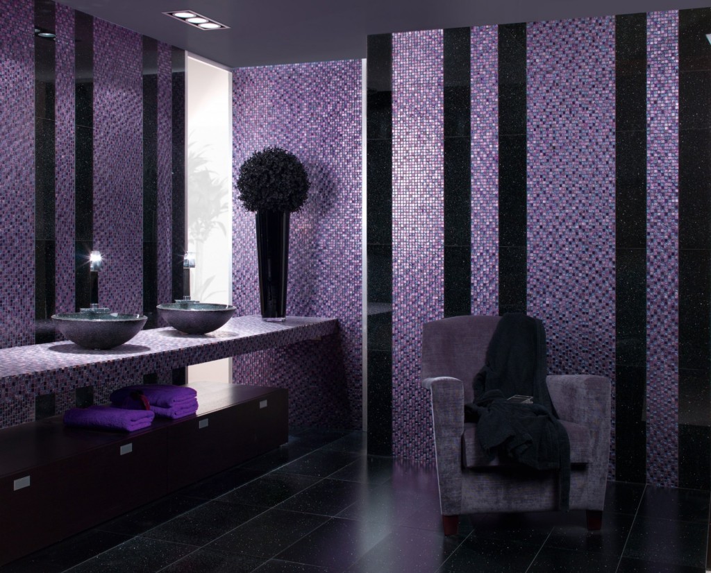 - fialová ako hlavná farba (obklady, stena) alebo ako doplnok (textílie, dekorácie),
