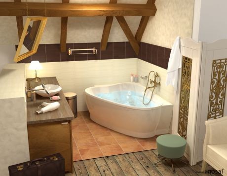 - podkrovná kúpeľňa s rohovou vaňou: drevené trámy doplnia retro ladenie a retro vodovodné batérie.
