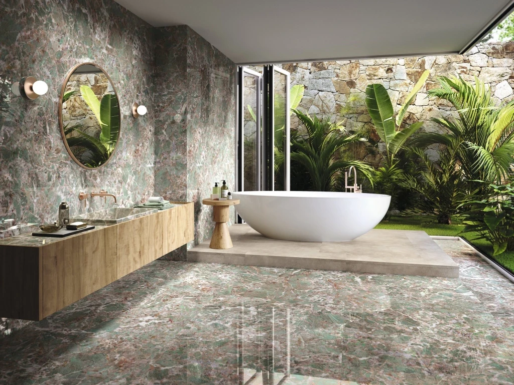 - kúpeľňový nábytok v drevodekore ako vyváženie kameňa,