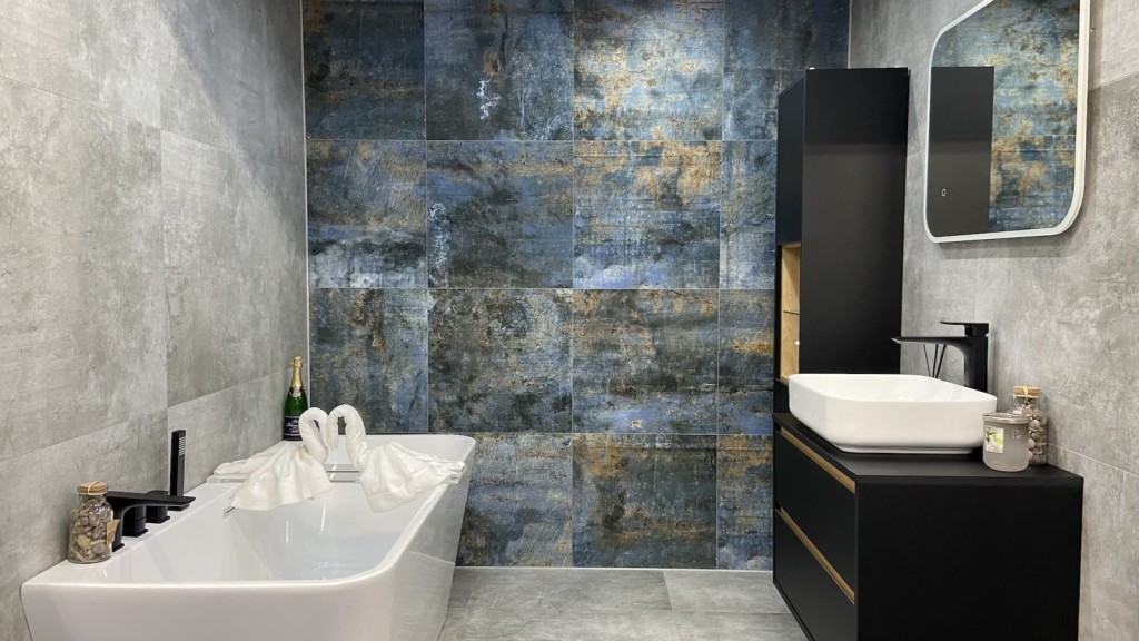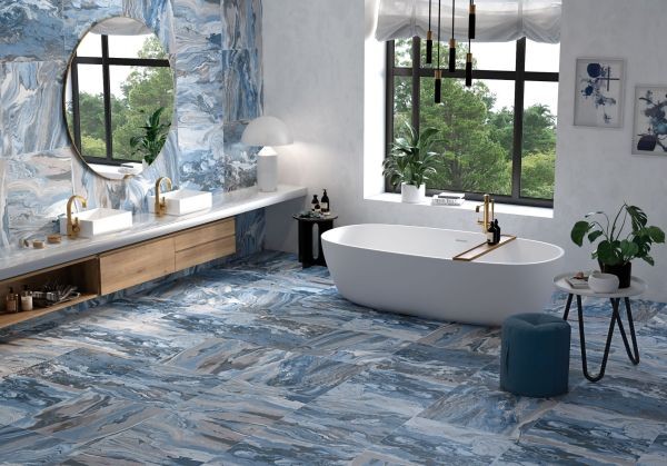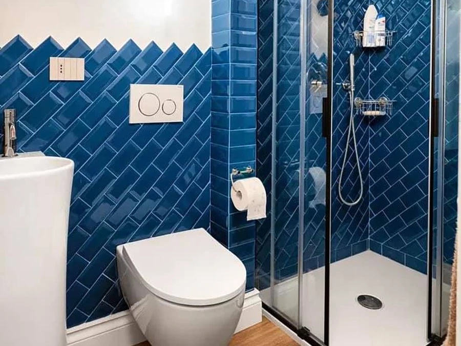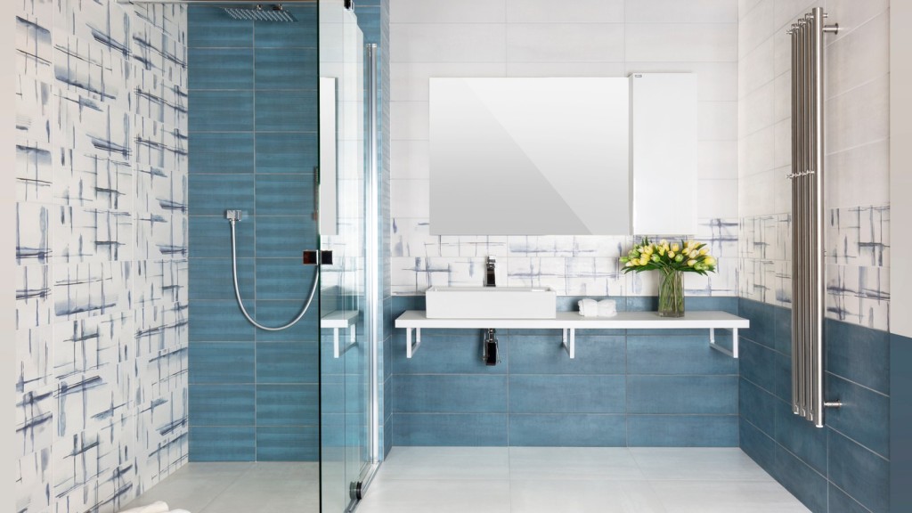 - modrá na obkladoch v lesku alebo mate. Lesk odráža viac svetla a kúpeľňa pôsobí vďaka tomu svetlejšie, matné prevedenie zase vyzerá modernejšie a tlmenejšie,