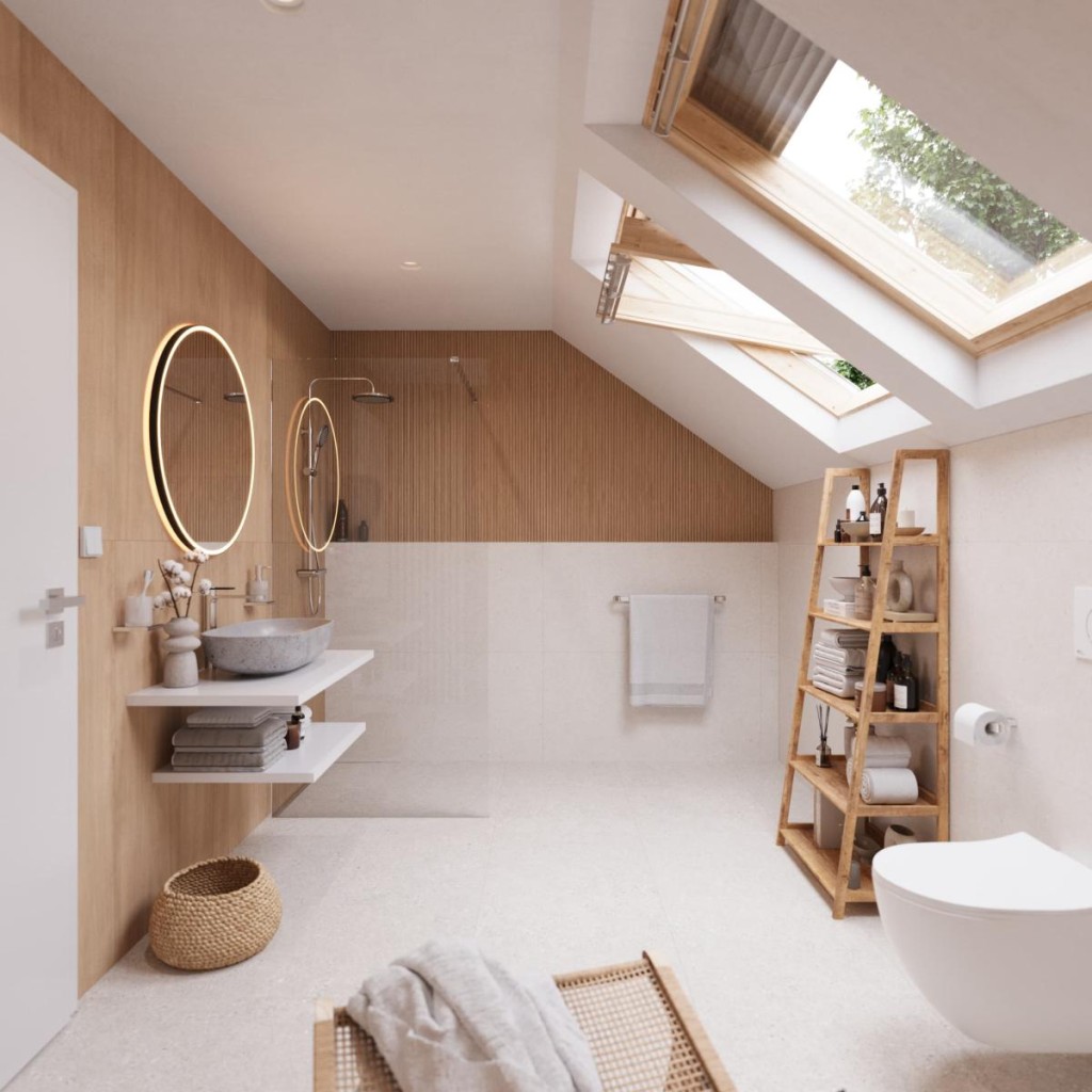 - pri variante kúpeľne v podkroví bez okna je kľúčové kvalitné odvetranie kúpeľne v podkroví a dostatok umelého svetla,