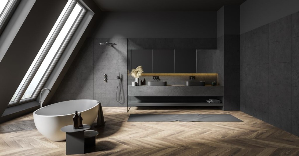 - veľké okná (keď sú) dovolia v kúpeľni aj tmavšie obklady a výraznejšie prvky,