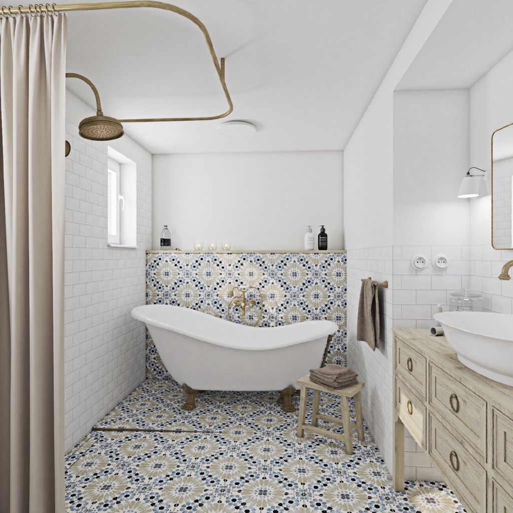 - dlaždičky, drevený nábytok s vintage akcentom,