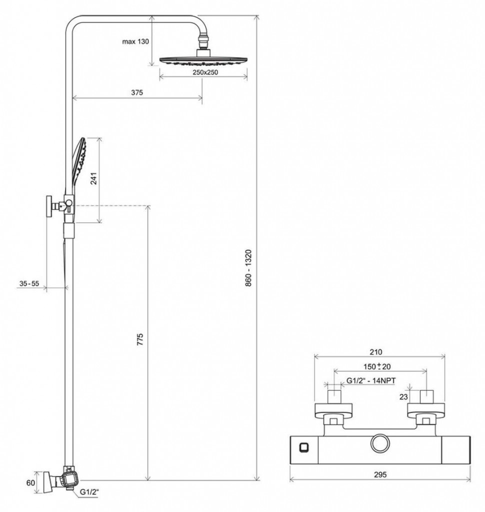 - sprchová hlavica, nástenná sprchová tyč, variabilná výška: 860-1335 mm, nástenný držiak