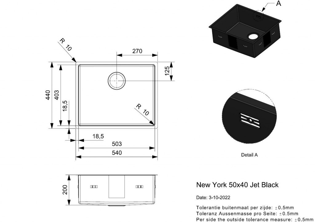 - Celkové rozmery drezu (ŠxHxV): 540 x 440 x 200 mm