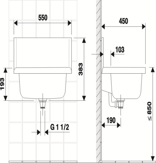 Plastové umývadlo so zadnou stenou s rozmerom 550 × 450 × 165 mm. Umývadlo je dodávané s prepadom, vtokovou armatúrou R1, sitom a zátkou s retiazkou. Komplet obsahuje aj montážnu súpravu so skrytými závesmi. Možnosť doplnenia stojánkovou vodovodnou batériou a dávkovačom tekutého mydla (0,45 l).
