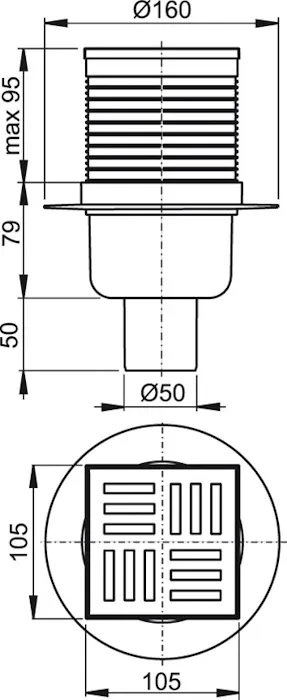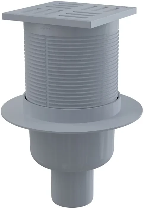 Podlahová vpusť 105 × 105/50 priama, mriežka šedá, vodná zápachová uzávera