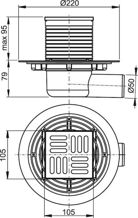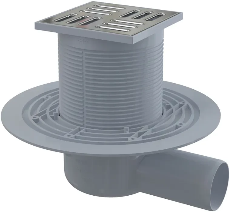 Podlahová vpusť 105 × 105/50 bočná, mriežka nerez, vodná zápachová uzávera