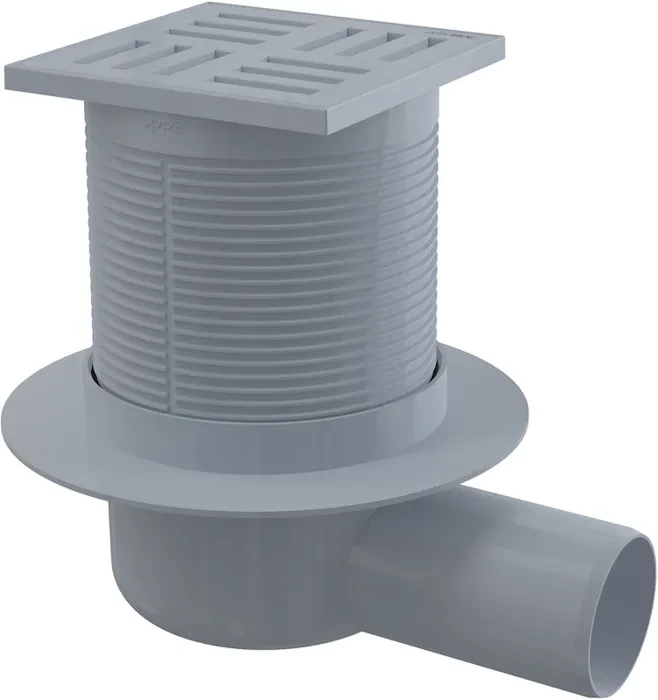 Podlahová vpusť 105 × 105/50 bočná, mriežka šedá, vodná zápachová uzávera