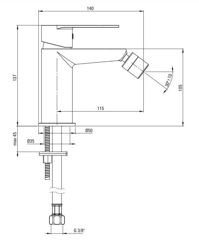 Páková bidetová batéria s pohyblivým zakončením výtoku je vyrobená z kvalitnej mosadze a vybavená najkvalitnejšou keramickou kartušou 35 mm. D osah výtoku u tejto batérie je 140 mm, výška batérie je 137 mm a výška výtoku je 105 mm