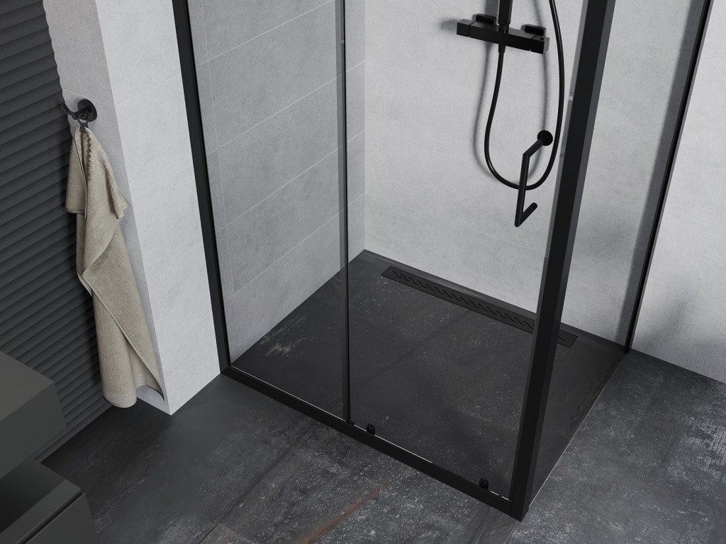 Sprchové dvere z kolekcie Mexen Apia . Funkčné posuvné dvere so spoľahlivými valčekmi, ktoré zaručujú plynulé a tiché posúvanie. Obliečka na skle uľahčuje ich čistenie, takže si môžete dlhšie užívať dokonale priehľadné a lesklé sklo. Tvrdené a bezpečné sklo a povrchové prvky dverí sú vyrobené z nerezového materiálu pokrytého čiernou farbou. Hliníkový profil s prahom, ktorý zaručuje dokonalú tesnosť.