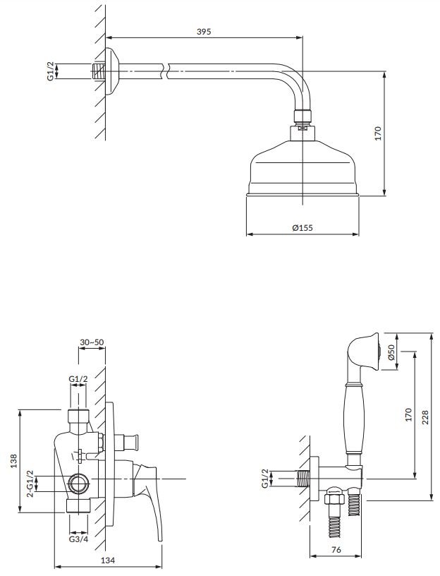- podomietková sprchová a vaňová batéria (AD5135ORB)) - veľkosť rozety: ø17 cm, dva vstupy (pre horúcu a studenú vodu): 1/2", dva výstupy zmiešanej vody: 1/2" a 3/4"