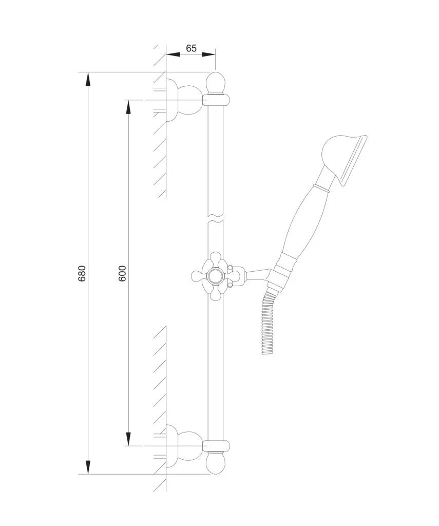 • mosadzná sprchová tyč, dĺžka: 68 cm, montážny rozstup: 60 cm, s posuvným jazdcom