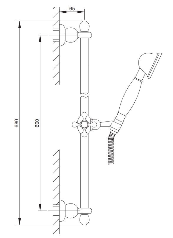 • mosadzná sprchová tyč, dĺžka: 68 cm, montážny rozstup: 60 cm, s posuvným jazdcom