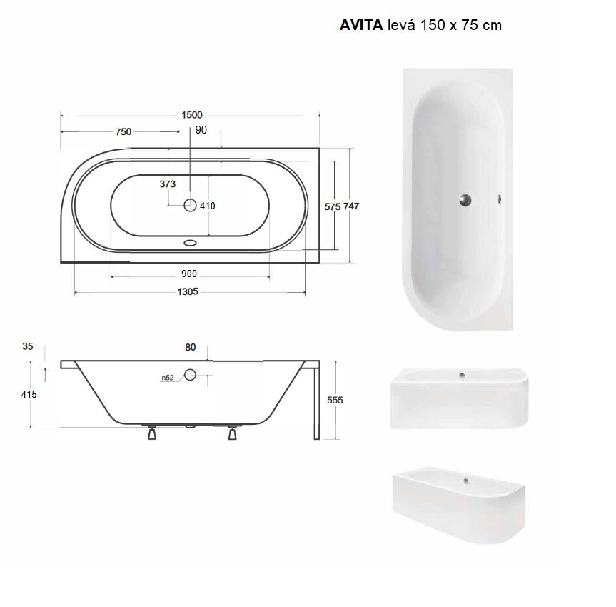 Dizajnová asymetrická vaňa AVITA so zaoblenými krivkami. Táto vaňa je vhodná ako do malých , tak ale aj do veľkých kúpeľní. Vaňa ponúka obojstranné veľmi pohodlné ležanie. Nožičky k vani je nutné dokúpiť. Túto vaňu je možné za príplatok objednať s povrchovou úpravou BeSafe* .