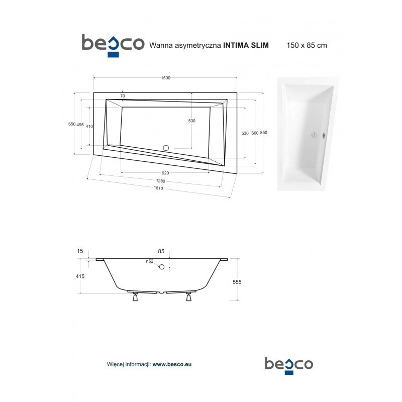 Dizajnová asymetrická vaňa INTIMA SLIM s ostrými krivkami s veľmi nízkou hranou (iba 15 mm ). Táto vaňa je vhodná skôr do menších kúpeľní . Vaňa ponúka obojstranné ležanie . Nožičky k vani je nutné dokúpiť. Túto vaňu je možné za príplatok objednať s povrchovou úpravou BeSafe* .