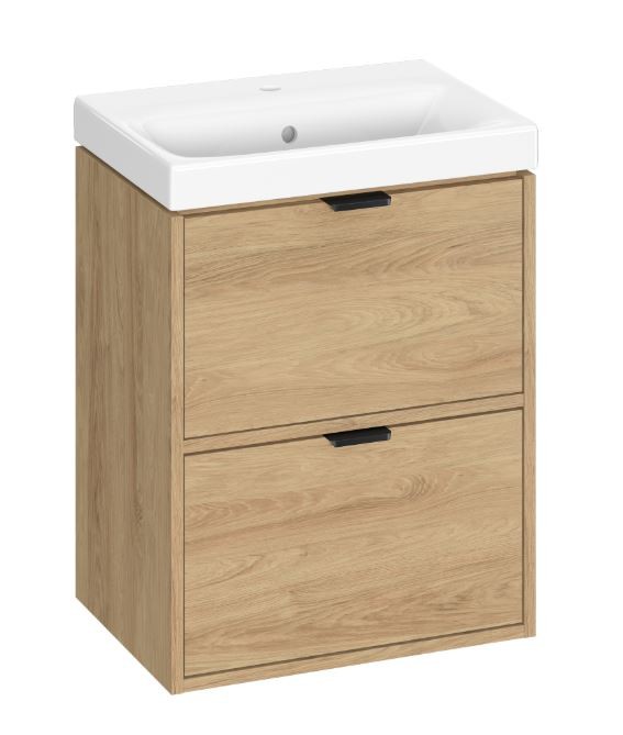 Skrinka pod umývadlo ATRATO SLIM 60 v dekore dub prináša do kúpeľne prírodný vzhľad a hrejivý charakter. Vďaka závesnému prevedeniu nezaberá miesto na podlahe a uľahčuje upratovanie. Dve priestranné zásuvky s plným dnom ponúkajú praktický úložný priestor pre každodenné potreby. Korpus aj čelá sú vyrobené z odolnej laminovanej drevotriesky. Skrinka je ideálna pre moderné aj klasické kúpeľne. Umývadlová skrinka SLIM je užším variantom klasických umývadlových skriniek, ideálna pre menšie kúpeľne alebo úzke priestory. Vďaka kompaktným rozmerom šetrí miesto bez toho, aby strácala na funkčnosti.