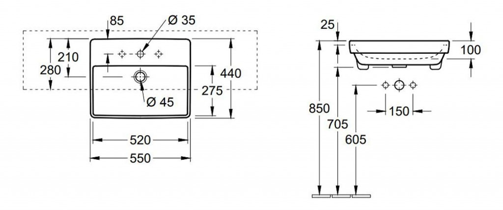 - vhodné pre 3-otvorové armatúry, prostredná otvor prerazený
