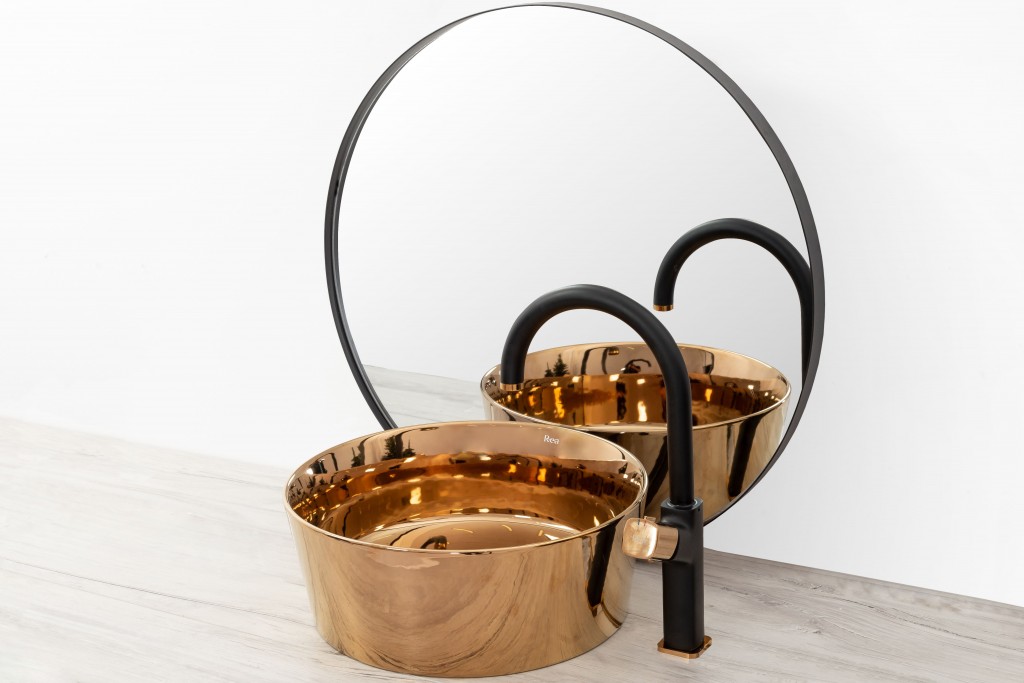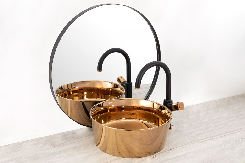 - oválne umývadlo na dosku Sofia , ktoré využíva kontrast rovnakých farieb. Vonkajšia strana je zlatá a vnútorná čierna. Vynikne v extravagantnejších kúpeľniach.