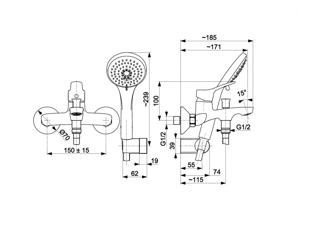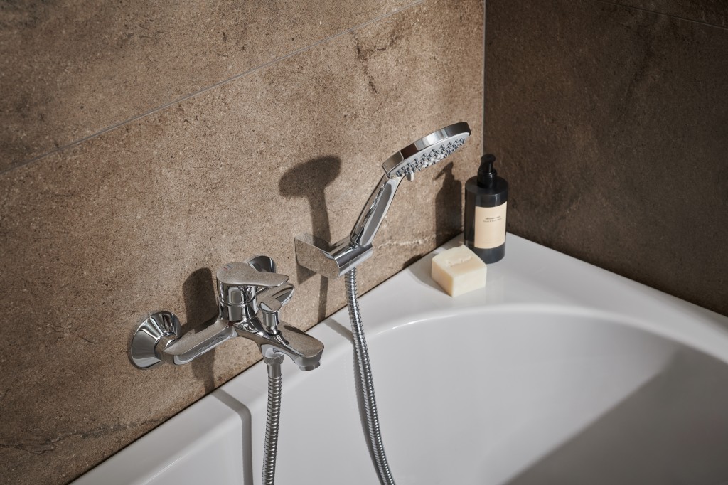 Nástenná vaňová batéria MORRIS od výrobcu KFA ARMATUR A s rozstupom 150 mm. Súčasťou batérie je jednobodový držiak, ručná sprcha z ABS s tromi funkciami a sprchová hadica PVC s dĺžkou 150 cm.