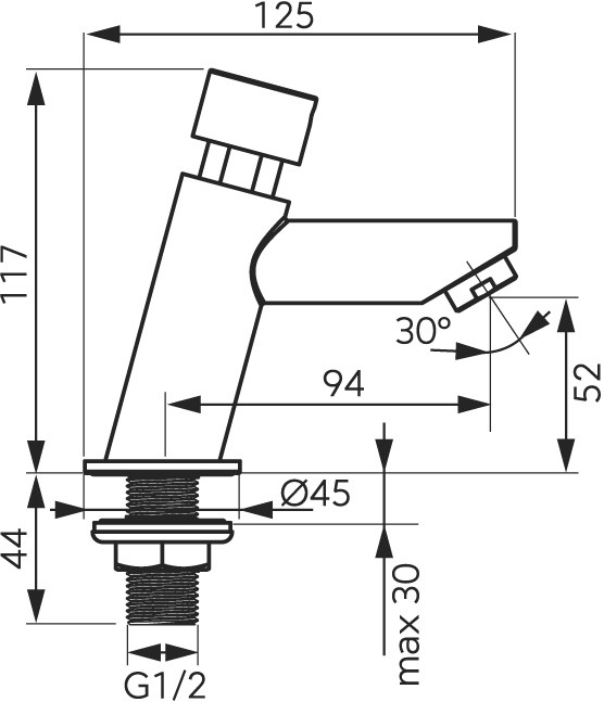 • nastaviteľná doba prietoku v rozsahu: 10 - 20 sec. (pre dynamický tlak 3 bary) • prietok vody pri dynamickom tlaku 0,3 MPa (3 bar): 11 l / min. 10 bar • pripojenie k vodovodnému poriadku: 1 x G1/2 G