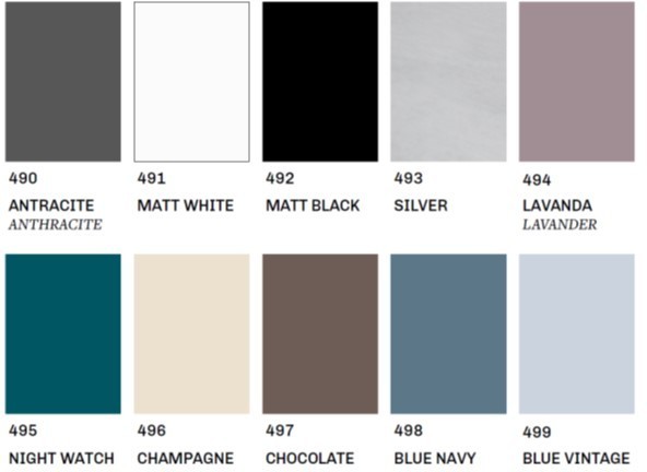 | Farba | Blue navy,Blue vintage,Anthracite,Matt white,Matt black,Silver,Lavanda,Night watch,Champagne,Chocolate |