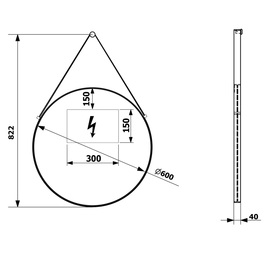 Zrkadlo okrúhle s LED osvetlením, priemer 60cm, kožený opasok, čierna matná 198411081