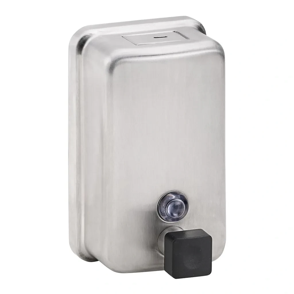 Nerezový dávkovač pre tekuté mydlo. Dávkovač má ručné ovládanie a je určený na inštaláciu na stenu.