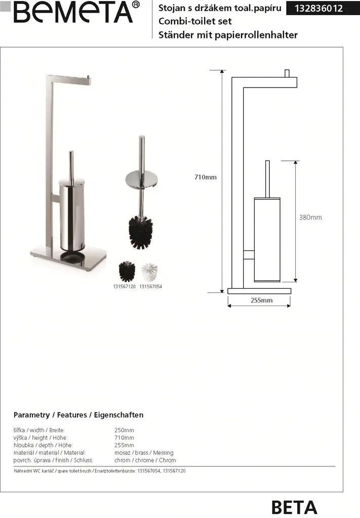 BETA stojan s držiakom toaletného papiera a WC štetkou 132836012 PARAMETRE Povrchová úprava Farba , Hmotnosť 3.642 kg Hĺbka 255 mm Šírka 150 mm Výška 710 mm(GT) (celý popis)