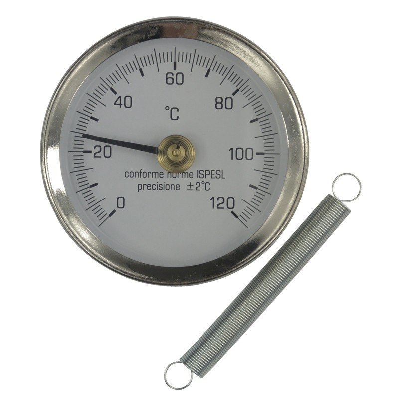 Teplomer bimetalový príložný je určený na meranie teploty kovových potrubných rozvodov a kovových rozvodov ústredného kúrenia. Teplomer umožňuje rýchlu informácíu o teplote v ktoromkoľvek mieste rúrkových rozvodov vykurovacích sústav bez nutnosti ich narušenia, a to jednoduchým priložením k povrchu rúrky. Na zadnej strane telesa je teplomer vybavený tažnou valcovou pružinou, ktorú je rúrka opásana. Teplomer bimetalový sa používa pre meranie teploty v rozmedzie 0-120 °C.