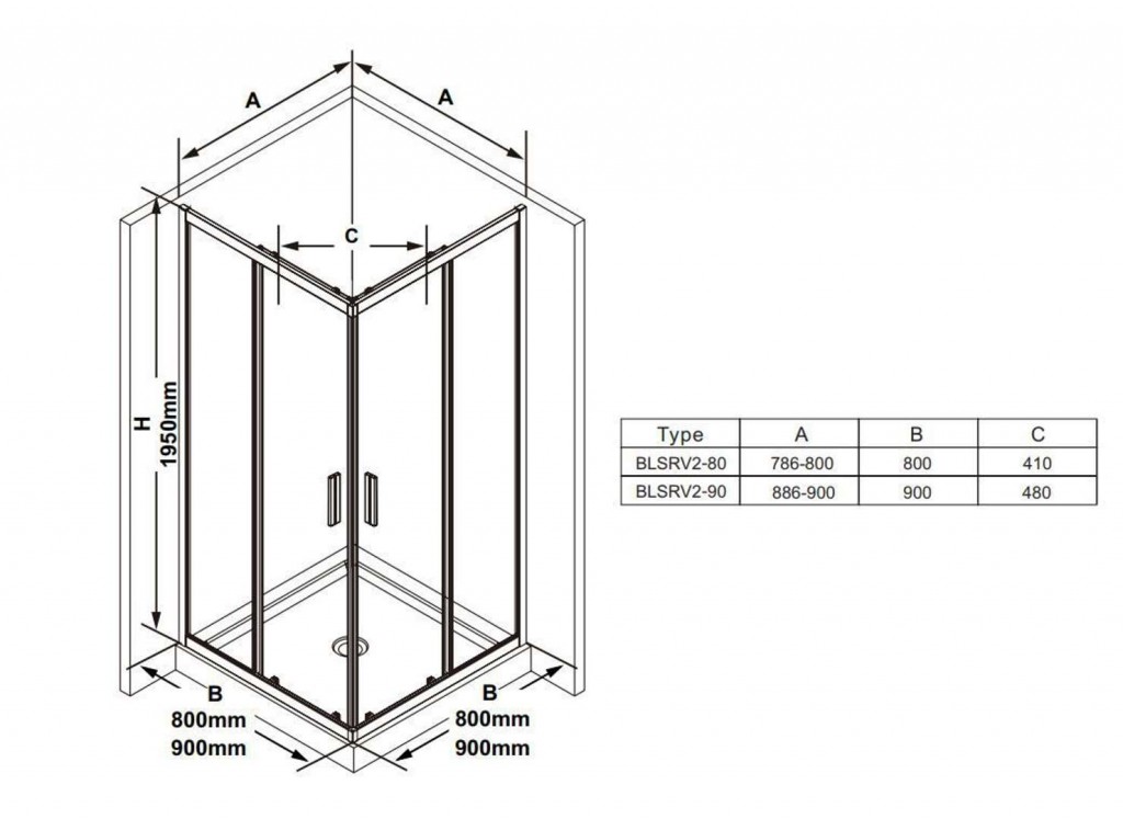 - rozmery: 900 x 900 mm, výška: 1950 mm