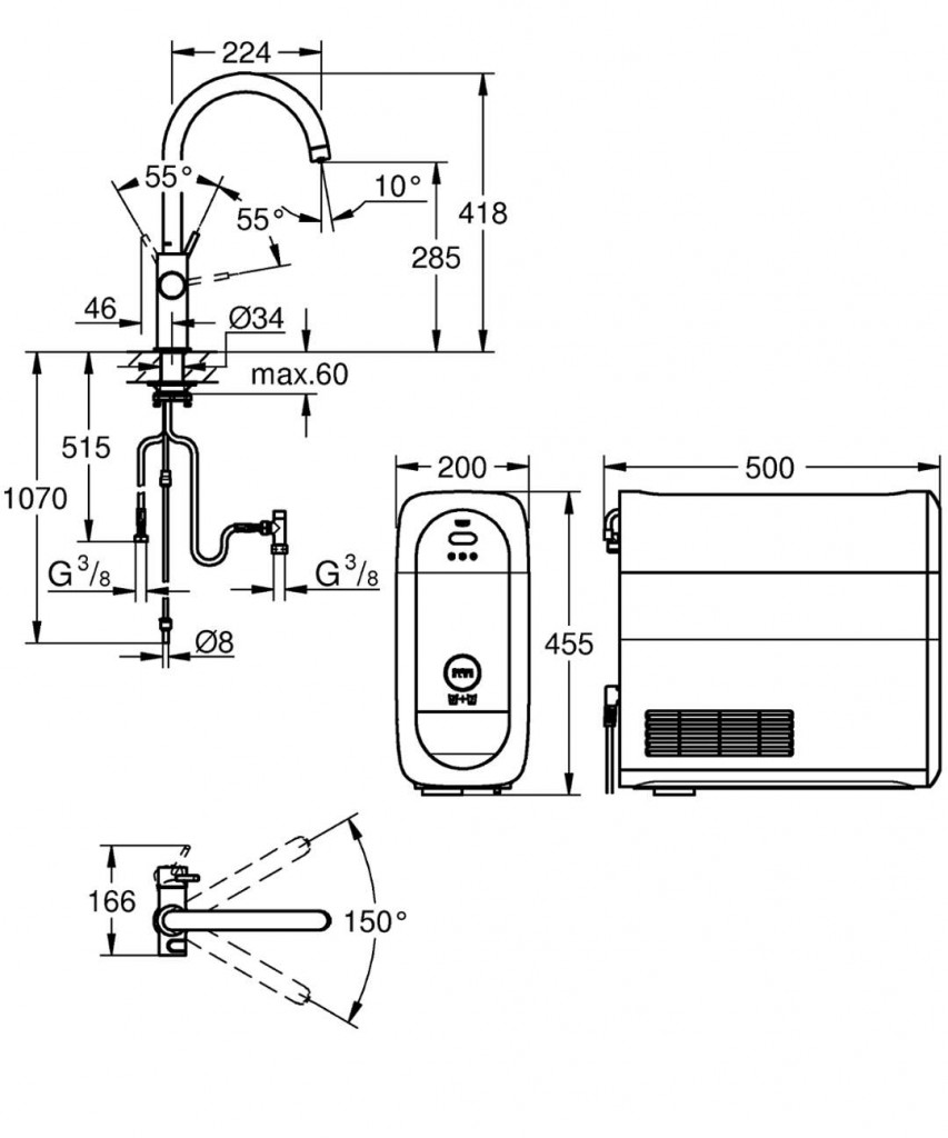 - nastavenie typu filtra - filter GROHE Blue veľkosti S, aktívny uhlíkový filter GROHE Blue alebo filter GROHE Blue magnézium +