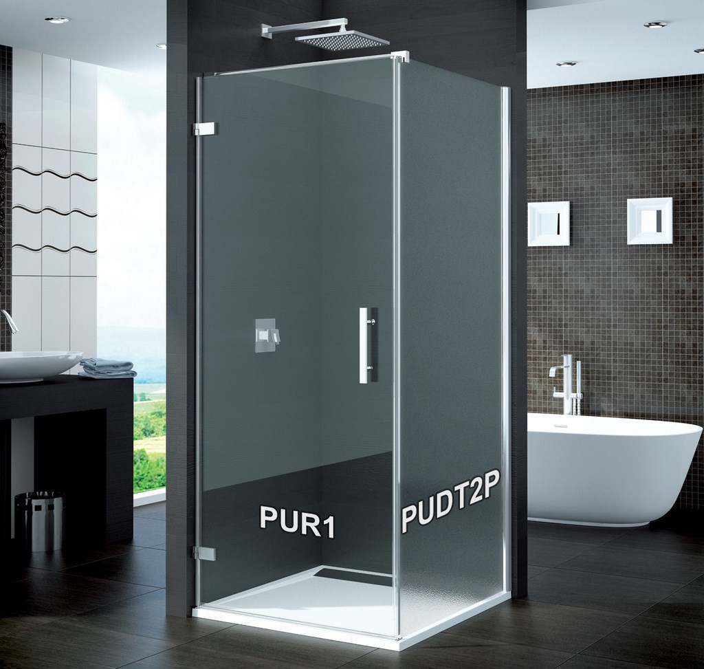 Impozantný čisté plochy bezrámových tabúľ bezpečnostného skla s elegantnými chrómovanými pántmi predstavujú dizajn sprchových kútov bez kompromisov - rad Pur.