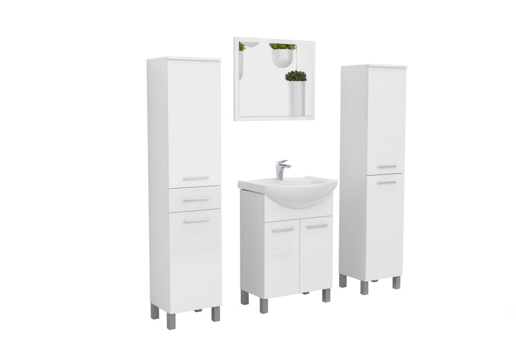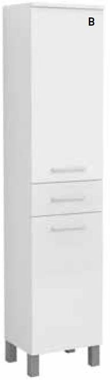 V zostave nábytku RINO nájdete aj túto v ysoká bočnej skrinku "B", ktorá má dvierka, šuplík a kôš na bielizeň. Dvierka sú osadené pánty s plynulým dovieraním. Skrinka RINO "B" sa dodáva vl drevom alebo pravom prevedení. Sety Rino sú elegantné a výborne sa hodí do modernej kúpeľne. Nábytok možno zavesiť aj postaviť na (ktoré sú za príplatok). Nábytok Rino sa dodáva v zmontovanom stave.