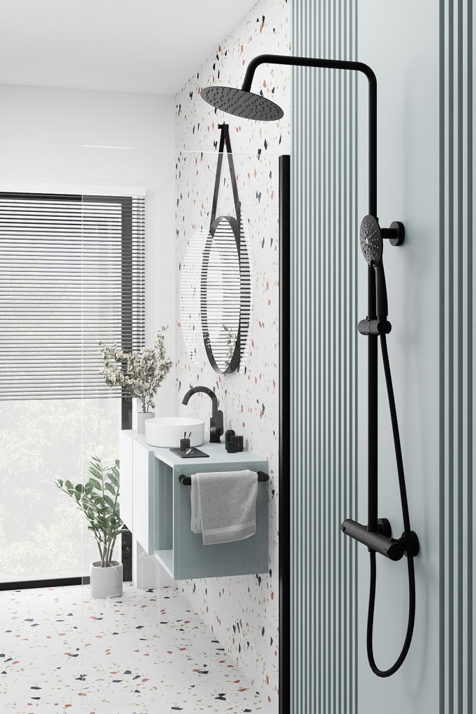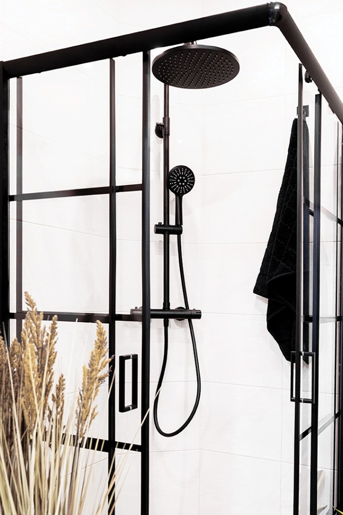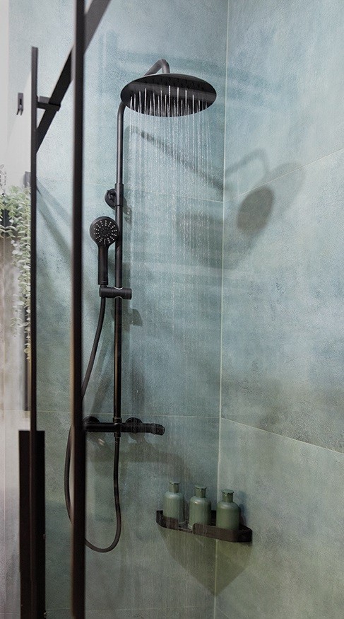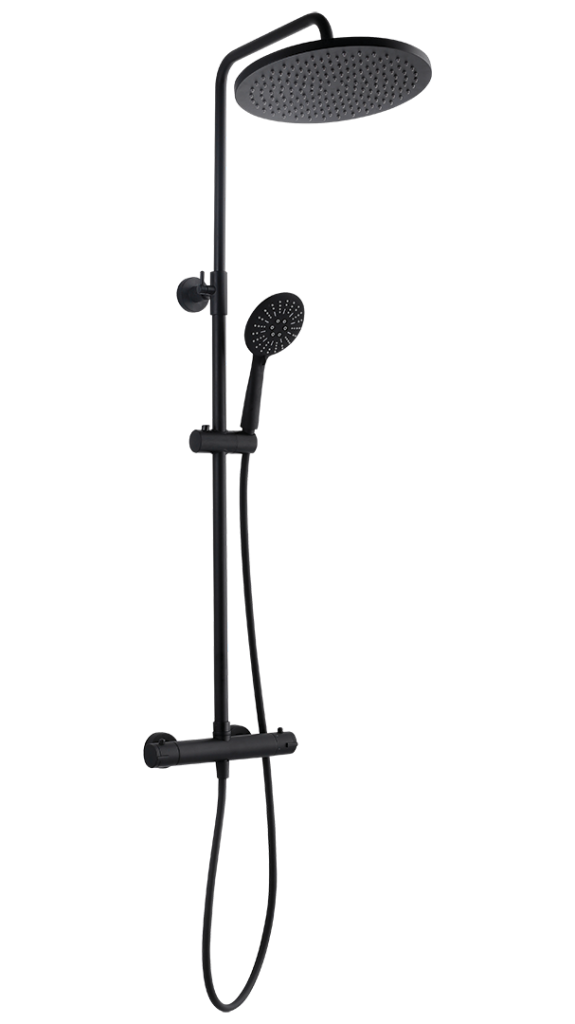 Sprchový stĺp Boro sa vyznačuje zaoblenými tvarmi a čiernou povrchovou úpravou. Súprava obsahuje termostatickú zmiešavaciu batériu, ktorá zaisťuje konštantnú teplotu (dôležité pre malé deti a seniorov). Nastaviteľná tyč umožňuje nastavenie požadovanej výšky. Okrúhla 30cm dažďová sprchová hlavica zaisťuje pohodlný kúpeľ, zatiaľ čo ručná sprcha s 3 funkciami umožňuje nastaviť prúd tak, aby vyhovoval každému členovi domácnosti. Jej čierna povrchová úprava dopĺňa čierne armatúry a dokonale sa hodí do moderných loftových a škandinávskych interiérov.