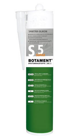 BOTAMENT® S 5 SUPAX je elastická těsnicí hmota pro výplň dilatačních a napojovacích spár v sanitárním a mokrém prostředí. BOTAMENT® S 5 SUPAX má ve vytvrzeném stavu vysokou odolnost proti působení horké vody, UV – záření, mnoha kyselin a louhů, stejně tak obvyklým čisticím prostředkům.
