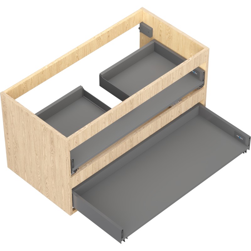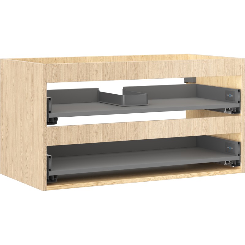 Špecifikácia produktu: Šírka: 90 cm Hĺbka: 44,2 cm Výška: 47 cm Farba: Dub Typ: Závesné Materiál: Kartón + PVC fólia Počet zásuviek: 2 Vodítka s funkciou tlmeného dovierania Plný výsuv pre ľahký prístup k obsahu zásuvky Povrch odolný voči UV žiareniu Kombinovateľný s dvierkami