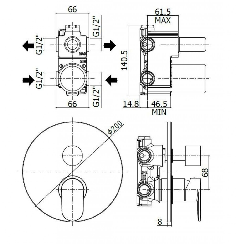 Sprchová páková batéria s otočným prepínačom vrátane podomietkového telesa pre 2 vývody