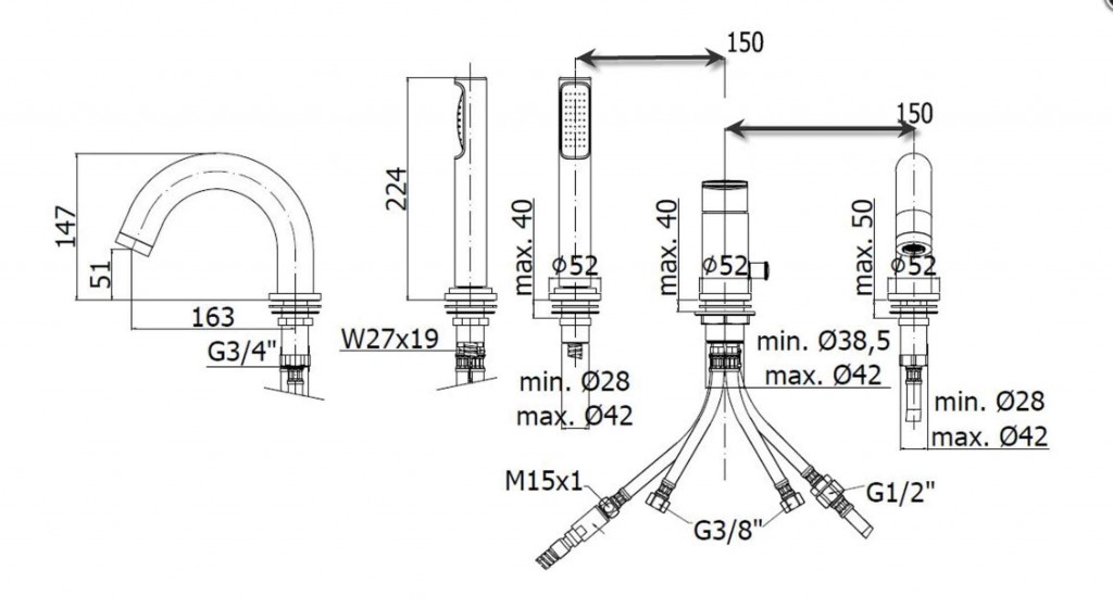 Vaňová trojotvorová stojanková páková batéria vrátane výtokového ramena