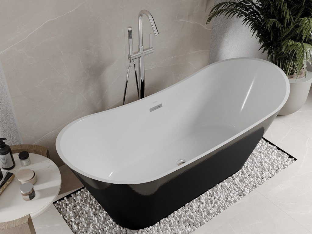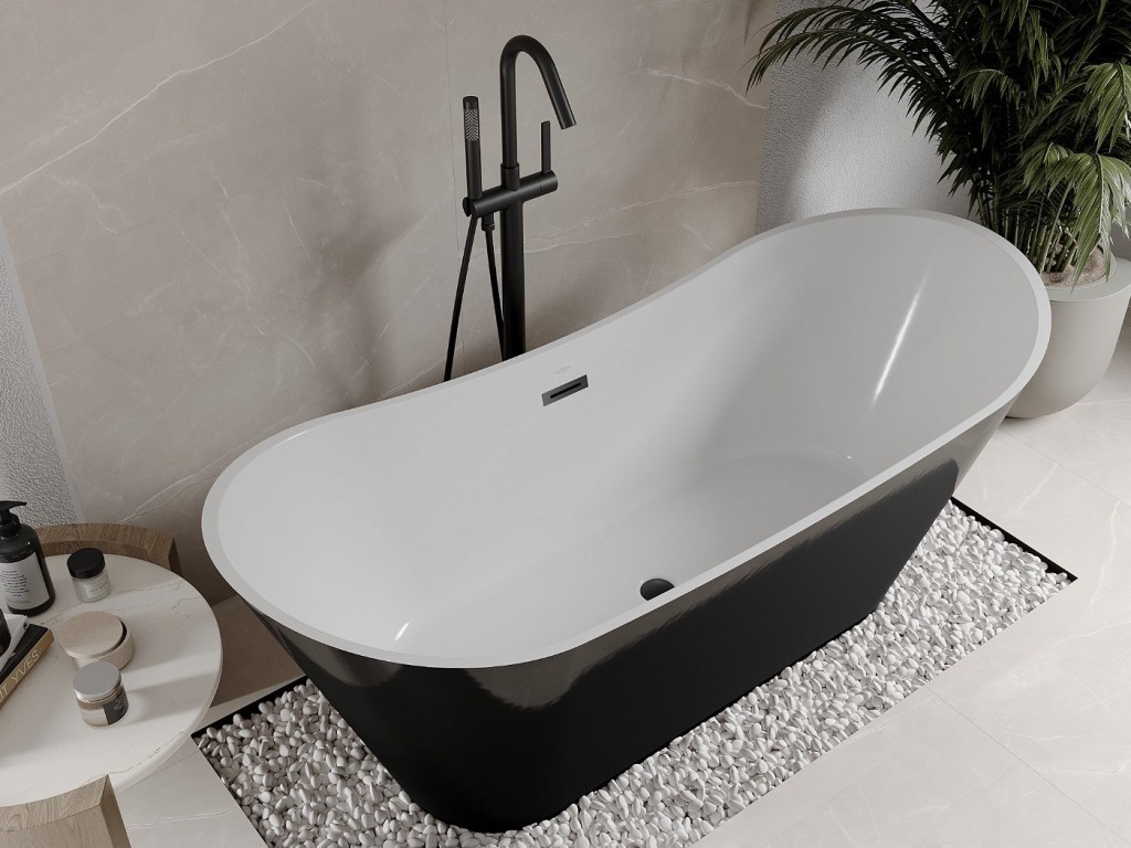 Voľne stojaca oválna akrylátová vaňa série Celia od výrobcu MEXEN s prepadom a umiestnenom odpade na stred vane.