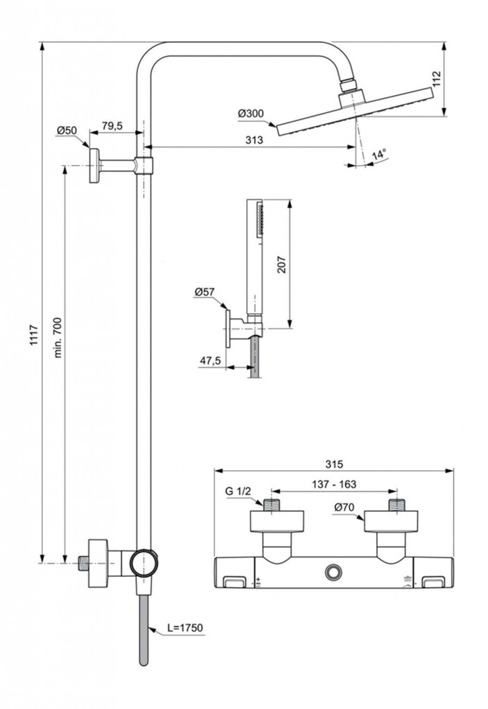 - priemer hornej sprchy: 300 mm