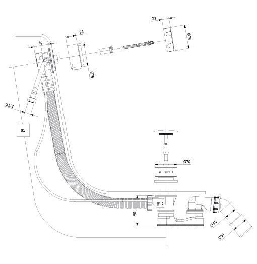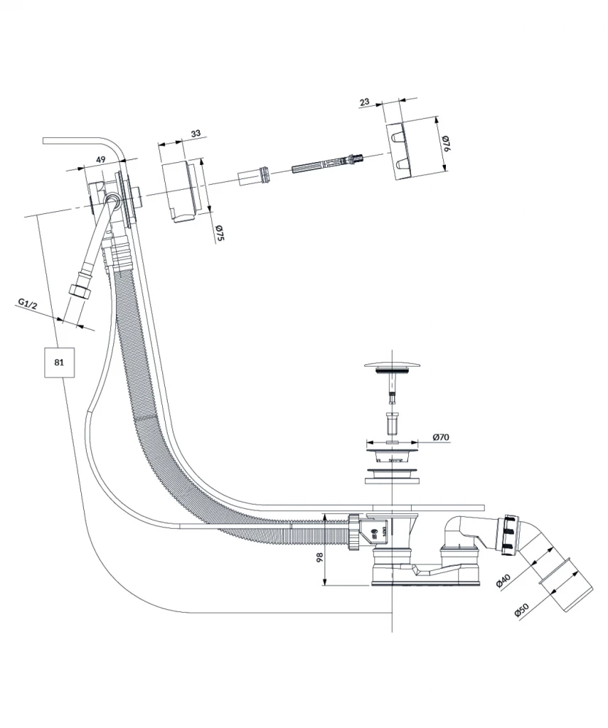 - výška sifónu: 11 cm, dĺžka: 81 cm