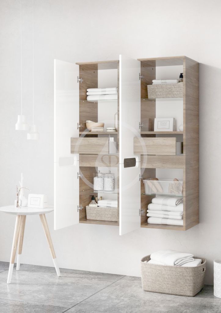 Skrinka s dvoma sklenenými poličkami a praktickou zásuvkou v hornej časti. Príslušná varianta je daná stranou, na ktoré sú pánty. Dvierka v bielom lesku, korpus podľa zvolenej farebnej kombinácie. Dodávané v zmontovanom stave vrátane montážnej sady (skrutky, pánty, záslepky). Skrinka je montovaná priamo na stenu, nemožno použiť nastaviteľné nožičky.