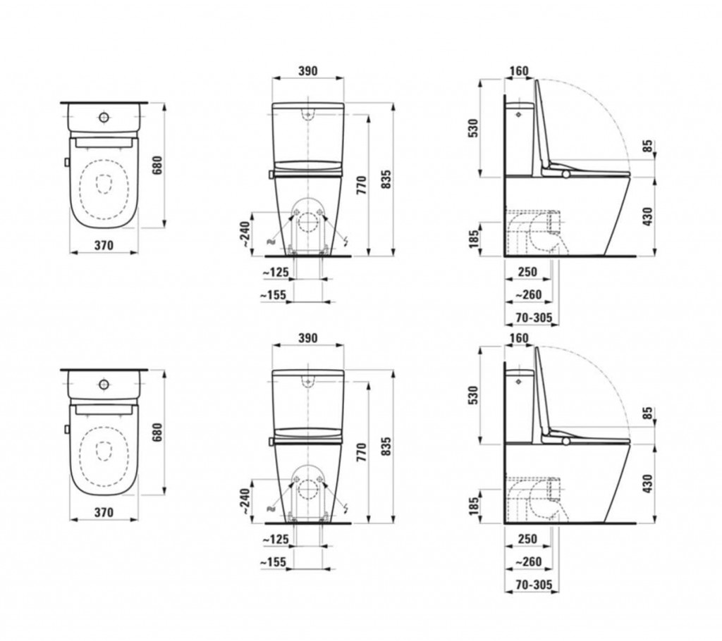 - 2 otvory na pripojenie vody a elektriny, vľavo a vpravo, pre sedadlo SIT